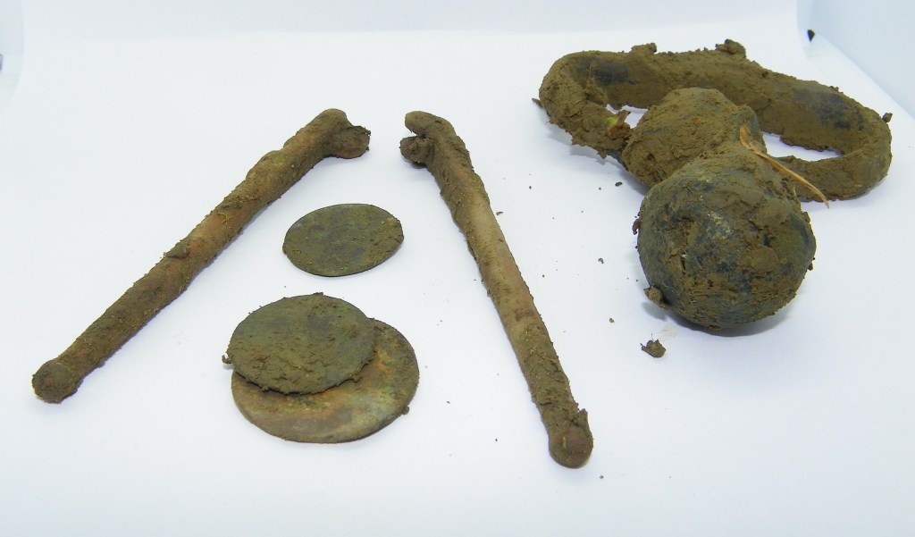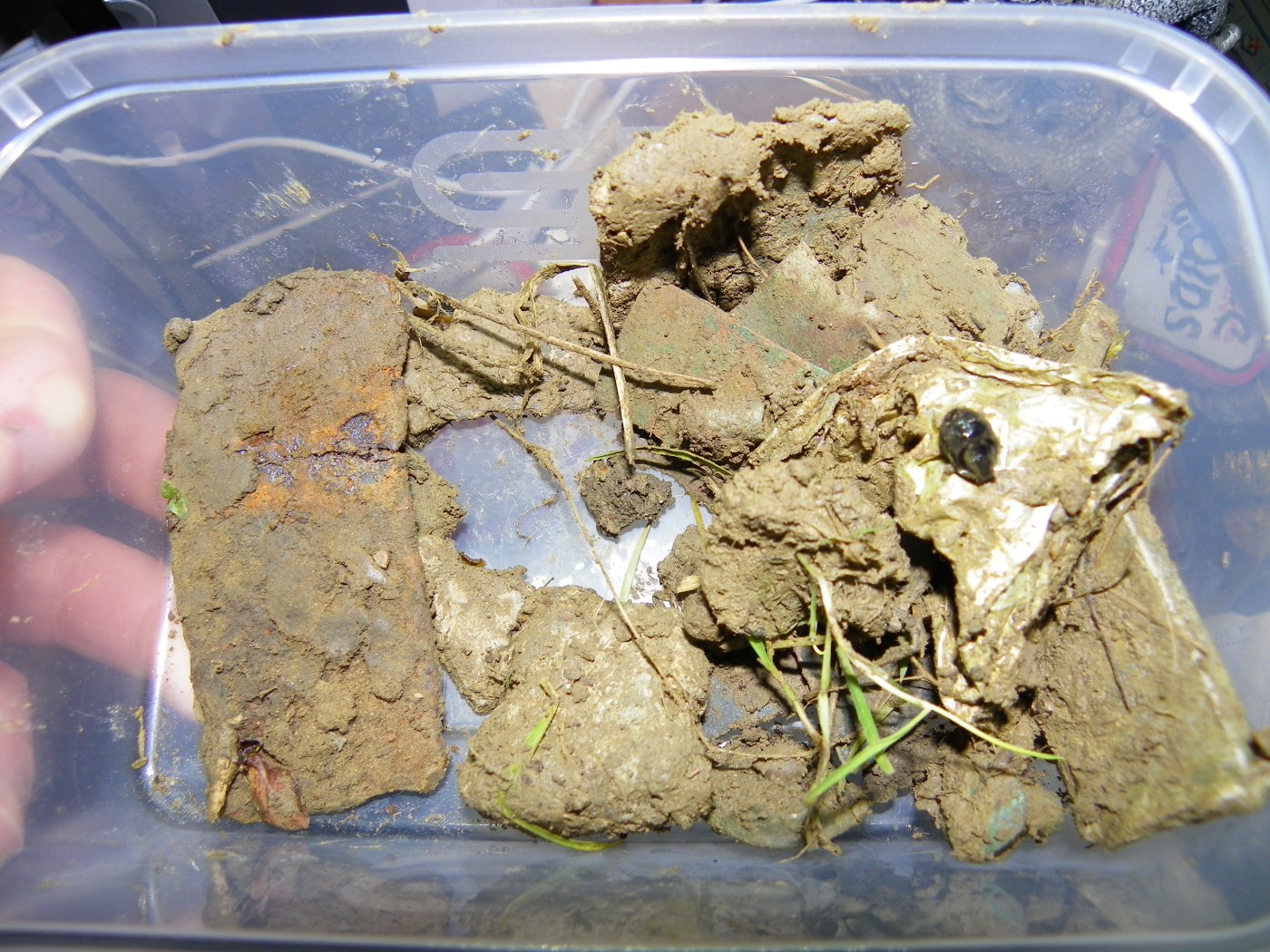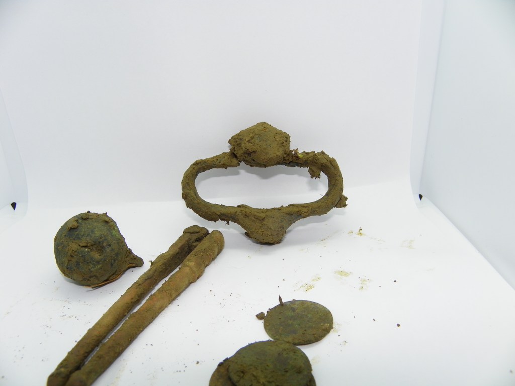 With the T2 set on 10 – 85 – 2+, & after wandering around a flooded field, finding the normal rubbish, & i mean the normal rubbish, even finding shotgun pellets on or below the surface, this i suppose proves that the T2 is working well, but trying to find something no bigger than a tiny fragment of a stone within the mud and glop is nigh on impossible, several half signals provided a frustrating search, with more scrap being found at the end of the signal… so where does the little cracker come in, well as the title says “T2 and the little cracker” after being frustrated with not much being found, i then had a copper coin signal at 69 – 75 not a stable number, but one that was a clear two-way signal, when out popped this bar, which i at first thought was a huge brooch pin, but the strange thing was the pin itself had a knope on the end, and not a point, after checking the hole i started to back fill when my eyes caught sight of another large looking brooch pin, which obliviously had came out of the same hole, now i had two of them ?