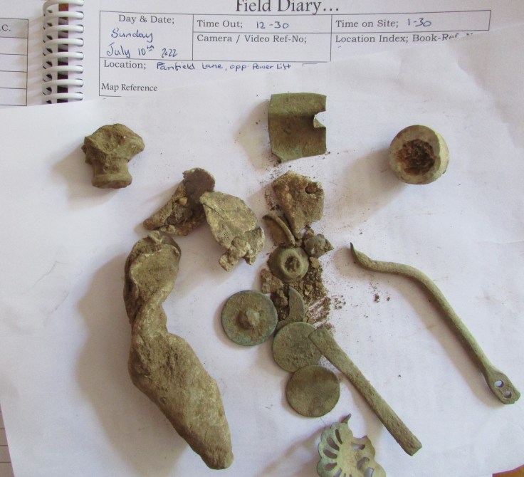 T2 pays a visit to more solid ground on Sunday with the dig meagre finds shown in the photos, top right in the photo is a sphere, which has been broken exposing a sponge fossil, followed by mostly scrap, a couple of pre-decimals, furniture fitting, and another object which i love finding, this one has two holes at one end…